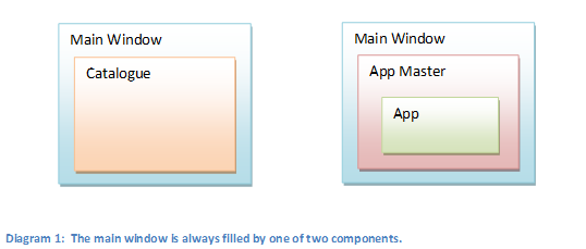 When an App is selected from the catalogue, the Catalogue is unloaded, the Main window loads the Master, and the Master loads the App. The App is retrieved from the web server, at that point and not before. Apps that have been retrieved once are cached by the web browser, as are shared libraries. When preparing an App for use in the portal care is taken not to copy in libraries into the xap file that are already present at the client.