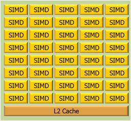 The idea is that a single instruction is executed on a lot of data, in parallel. The SIMD processing unit is particularly fit for “data parallel” algorithms. A GPU may consist of 32 SIMD cores (yes, the image shows 40 cores) that access memory with 32 floats at a time (128 bit bus width). Typically the processor runs at 1Ghz, and has a (theoretical) computational power of about 1 TeraFLOP.