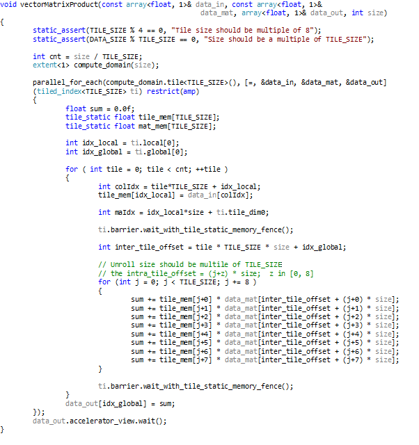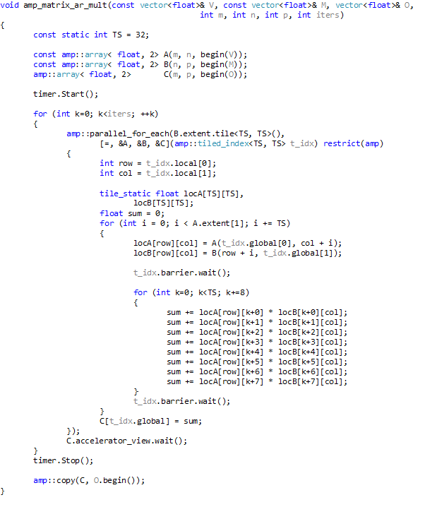 Here: amp is an alias for the Concurrency namespace. The tile size TS has been set to 32, which is the maximum; the product of the dimensional extents of a compute domain should not exceed 1024. The extent of the compute domain has been changed to depend on B, the matrix, instead of the output vector. The loop that sums element products has been unrolled in order to further improve performance.