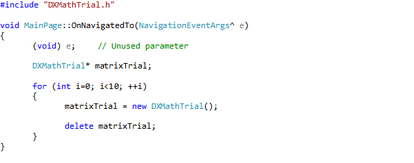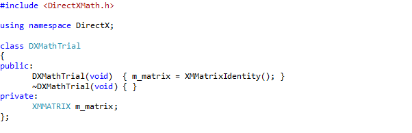 1. Although the DXMathTrial holds the XMMATRIX, the MainPage object has to do all the work to get the instantiation right. This is not really like the OO spirit, it doesn’t seem fair. The DXMathTrial class should hold the code to make instantiation of its objects easy and natural.