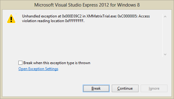 The error message looks like this, location 0xFFFFFFFF is typical for this error: