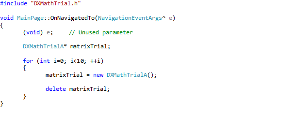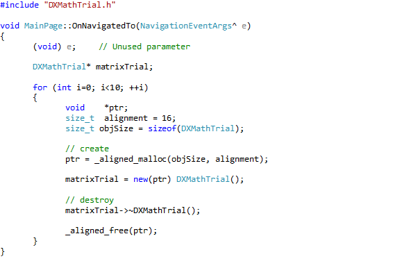 1. Use of _aligned_malloc and placement new by the MainPage class. This leaves the DXMathTrial class unchanged