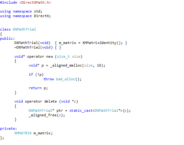 Overloading new and delete is well treated in e.g. S.B. Lippman et all.: C++ Primer, Fifth Edition). It boils down to allocating memory in a user defined new operator overload, and de-allocating it in a user defined delete overload. In this case we will do the (de-) allocation with the ‘aligned’ variants, which gives us the following definition for the DXMathTrial class.