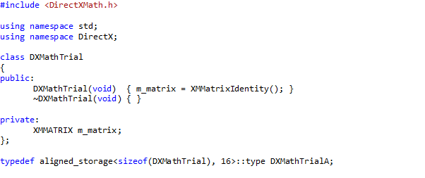 The Standard Template Library contains the aligned_storage class. It is a template that takes two value parameters: the size of the memory to be allocated, and the required alignment. To use it we add one line of code (!) to the DXMathTrial.h file to define an aligned version of the DXMathTrial class, which we will call DXMathTrialA (appending the ‘A’ may become a naming convention). We adapt our MainPage code accordingly. This gives us the following class:
