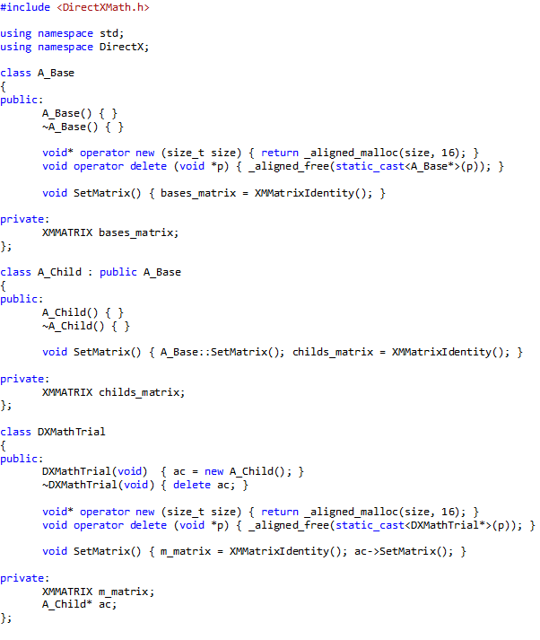 The final question we would like to see answered is to what extent the solution involving overloaded new and delete operators propagates through membership and inheritance relations. To that end we define a class A_Base, and A_Child that both contain an XMMATRIX member, and both assign the identity matrix to this member in a dedicated method. A pointer to class A_Child will be a member of the DXMathTrial class, and allocation will be on the heap. The classes look like this.