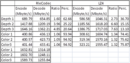 For depth data, we see that the RleCodec delivers fastest compression. LZ4 delivers faster decompression, and obtains stronger compression.