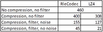 As noted above, the differences between the core RleCodec and LZ4 are insignificant compared to the effects of the DiscreteMedianFilter and taking the Delta.