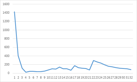This is a kind of a surprise. I ran the program several times, and the results have a somewhat statistical character, but one or two peaks at the end of the x-axis are always there.