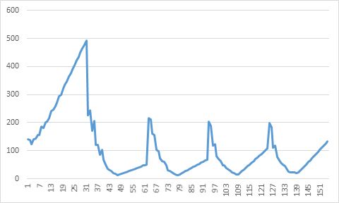 If we let the library process input stream of length 65536 * i with i = 1, …, 256 (65536 * 256 == 2^24), we may get the following graph.