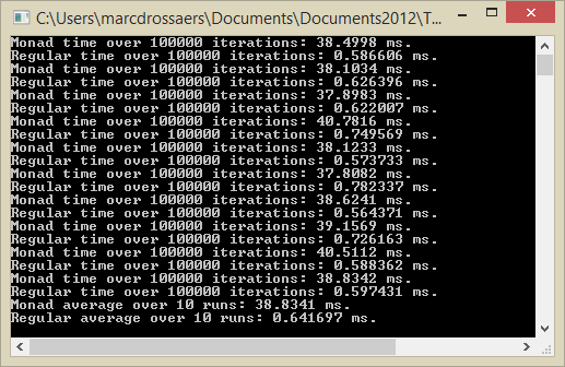 Now, time performance results are dominated almost completely by the use of std::cout and throwing exceptions. If both are used, or occur, times are comparable. If however, we do not log to the console, and have no exceptions thrown (we set value to 32), that is, we measure the performance at the naked difference of the constructed code, the regular code takes only 1.6% of the time the monad solution takes, i.e. the regular solution is about 60 times as fast, see the image below for a typical performance run.